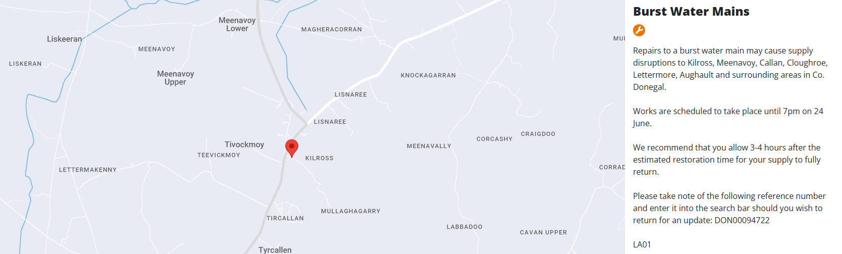 Uisce Eireann says repairs to a burst water main may cause supply disruptions to Kilross, Meenavoy, Callan, Cloughroe, Lettermore, Aughault and surrounding areas on the Letterkenny side of Stranorlar.