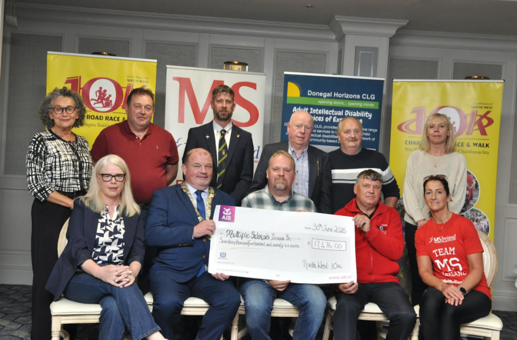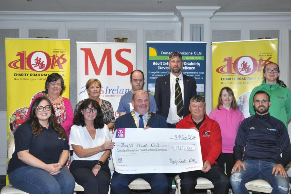 It’s a monumental milestone for all involved with the North West 10K, with the two 2025 charities, Donegal Horizons CLG and Multiple Sclerosis Donegal Branch, each receiving cheques of €17,476.