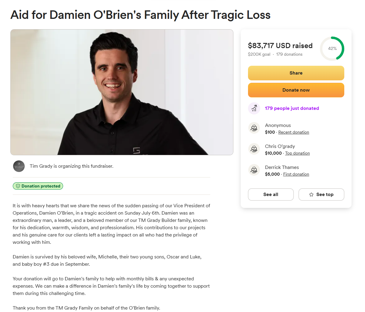 Damien O’Brien, who was struck by a car, is survived by his wife Michelle, and their two young sons, Oscar and Luke, with another baby boy due in September.