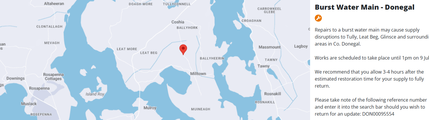 Repairs to a burst water main in Fanad may cause supply disruptions to Tully, Leat Beg, Glinsce and surrounding areas this afternoon.