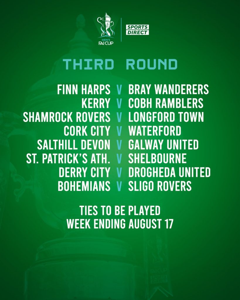 The rest of the ties are full of Dublin and provincial derbies with St. Patrick’s Athletic welcoming Shelbourne, Cork City face Waterford, Salthill Devon host Galway United and Kerry take Cobh Ramblers while Shamrock Rovers go up against Longford Town.