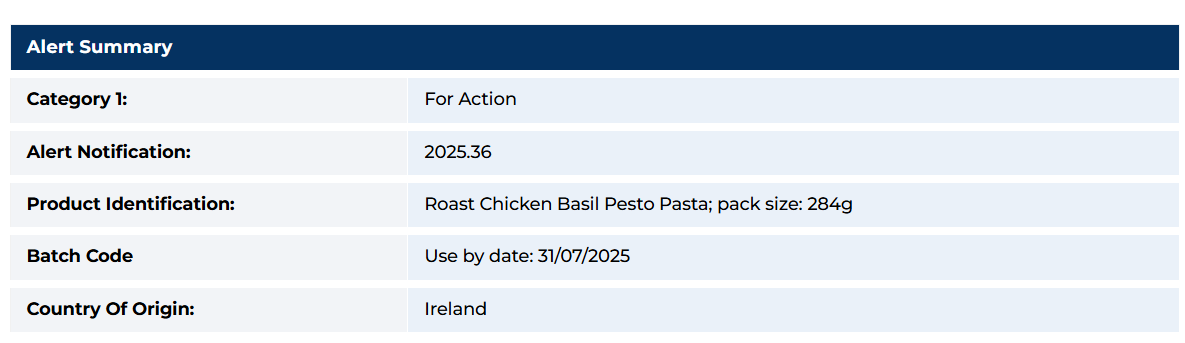A batch of Aldi’s Roast Chicken Basil Pesto Pasta has been taken off supermarket shelves due to the presence of Listeria monocytogenes.
