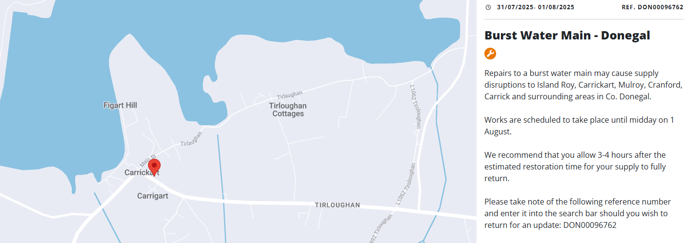 Uisce Eireann says repairs to a burst water main in the vicinity of Carrigart may cause supply disruptions to Island Roy, Mulroy, Cranford, Carrick and surrounding areas this afternoon and into tonight.