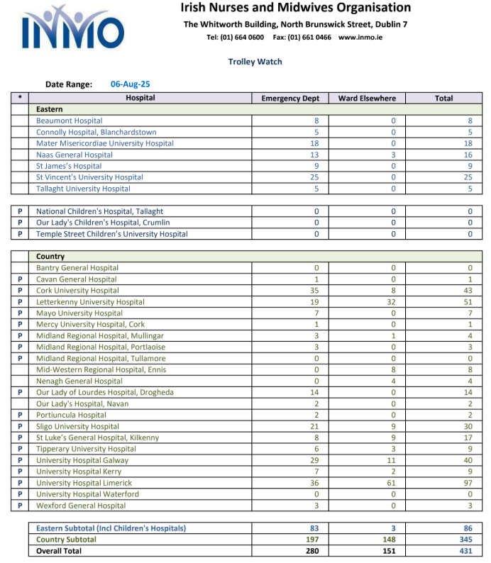 There were 51 patients in inappropriate areas of the hospital this morning, 19 of them on Emergency Department trolleys according to the INMO.