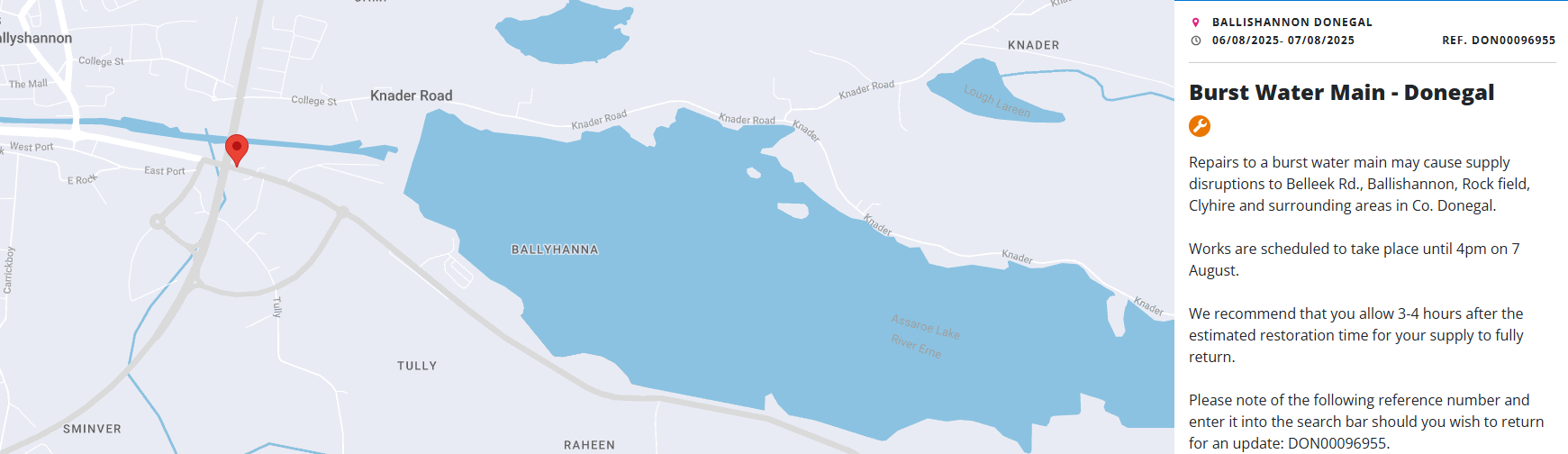 Uisce Eireann says there may be supply disruptions around Belleek Rd, Rock field, Clyhore and surrounding areas until 4pm this afternoon.