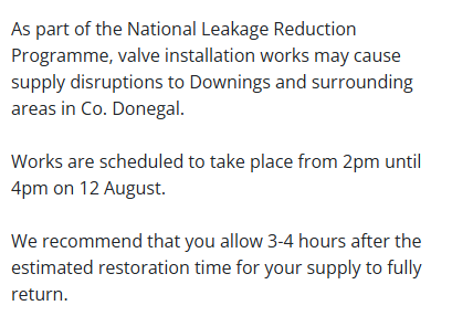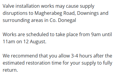 Meanwhile, as part of the National Leakage Reduction Programme, valve installation works may cause supply disruptions in the vicinity of Downings from 9am until 11am and again from 2pm until 4pm today.