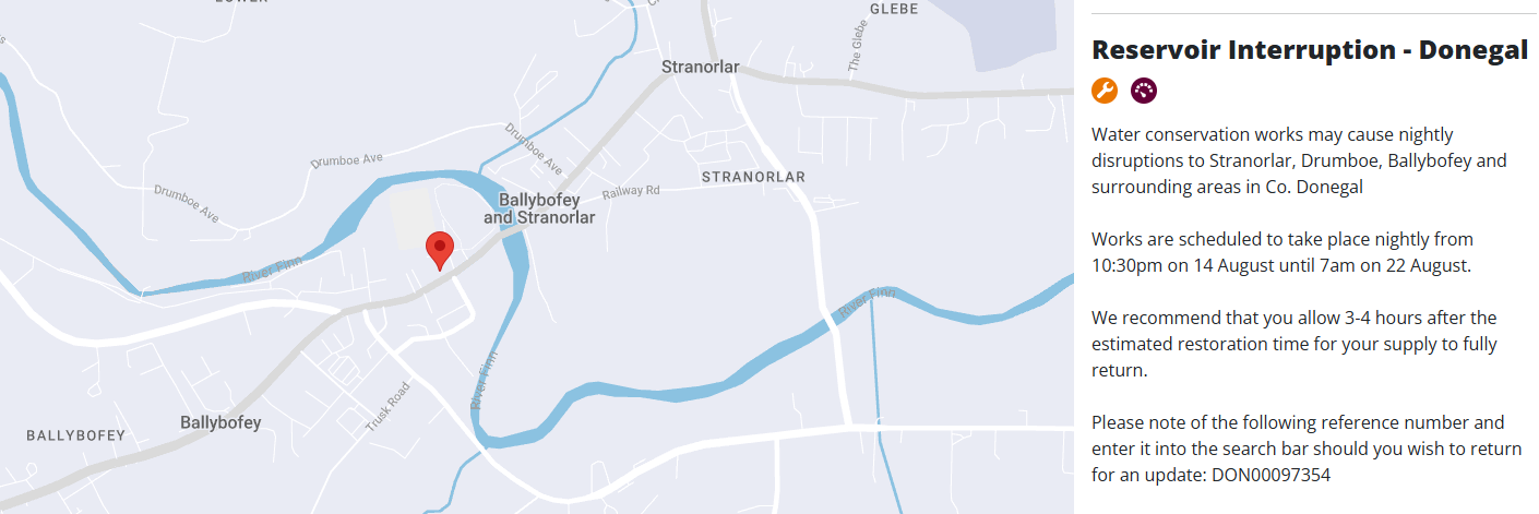 Uisce Eireann says water conservation works may cause nightly disruptions to Stranorlar, Drumboe, Ballybofey and surrounding areas in Co. Donegal