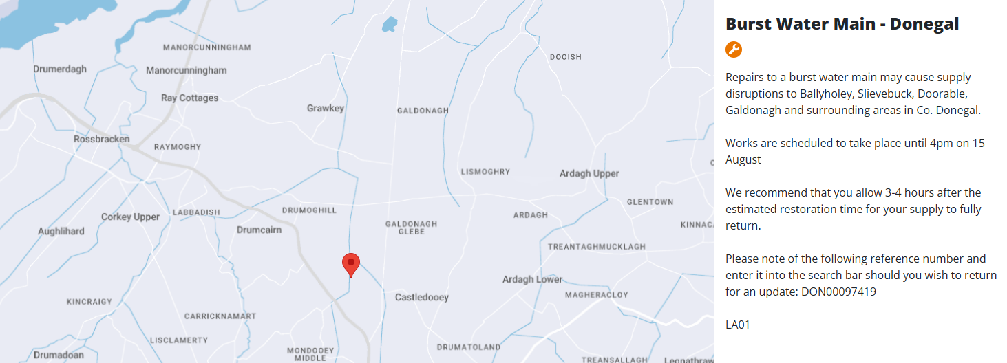Asa a result, they say there may be supply disruptions at Ballyholey, Slievebuck, Doorable, Galdonagh and surrounding areas in Co. Donegal.