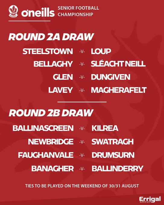 The draw has been made for the round 2A and round 2B games of the Derry Senior Football Championship, as seen here.