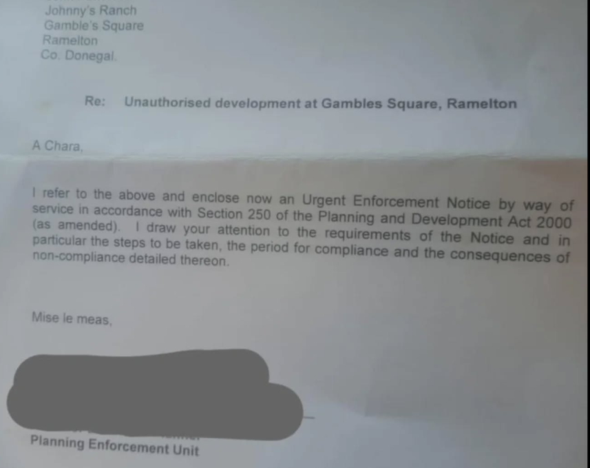 Johnny’s Ranch has been served with an enforcement order by Donegal County Council, and a recent incident of alleged criminal damage at the facility is being investigated.