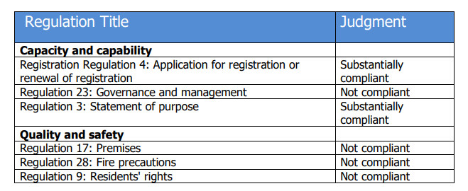 The inspection assessed six Regulations under the themes of Capacity and Capability and Quality and Safety. Of these, four were found to be non-compliant, while two were deemed substantially compliant. The areas of non-compliance included governance and management, premises, fire precautions, premises and residents’ rights.