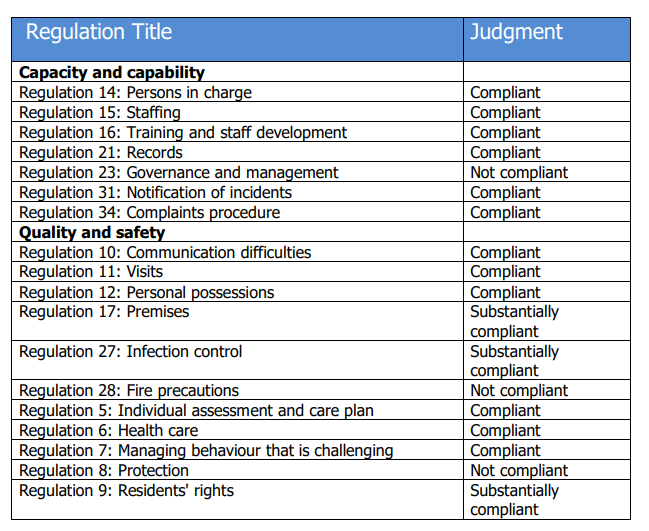 However, three non-compliances were noted, in the areas of governance and management, fire precautions and protection.