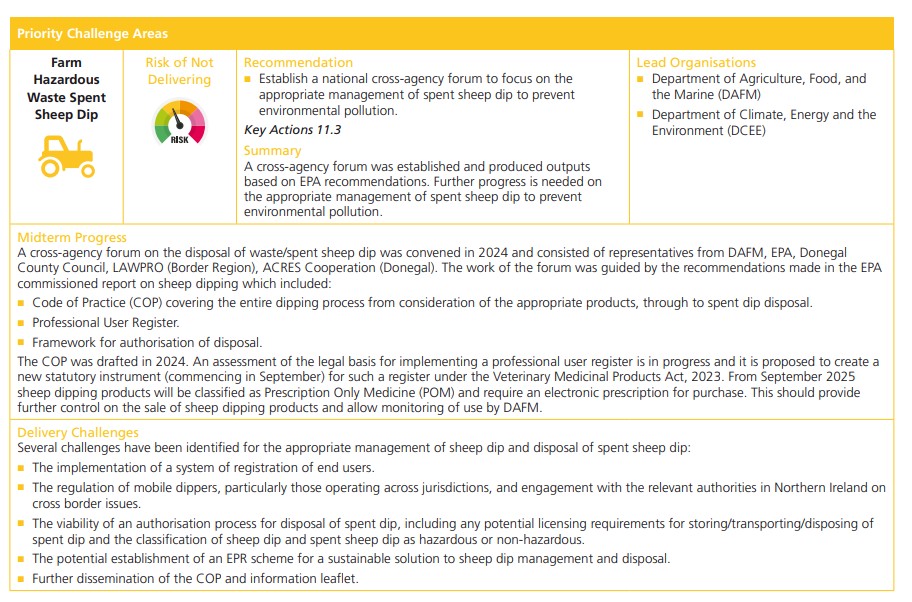 The EPA’s mid-term Evaluation of the National Hazardous Waste Management Plan includes a section on sheep dipping which notes issues in Donegal in recent years.