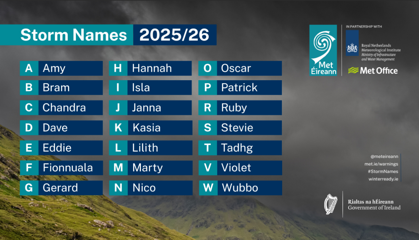 The Irish storms have been named as Bram, Fionnuala, Gerard, Kasia, Marty, Patrick and Tadhg.