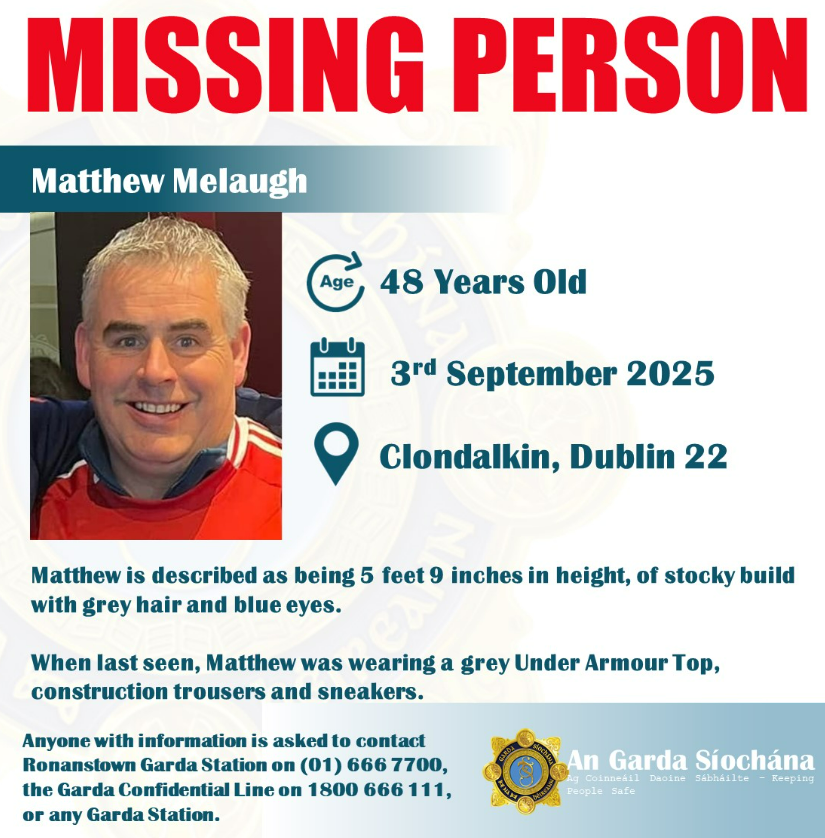Gardaí are seeking the public’s assistance in tracing the whereabouts of 48 year-old Matthew Melaugh, who’s been reported missing from Clondalkin in Dublin.