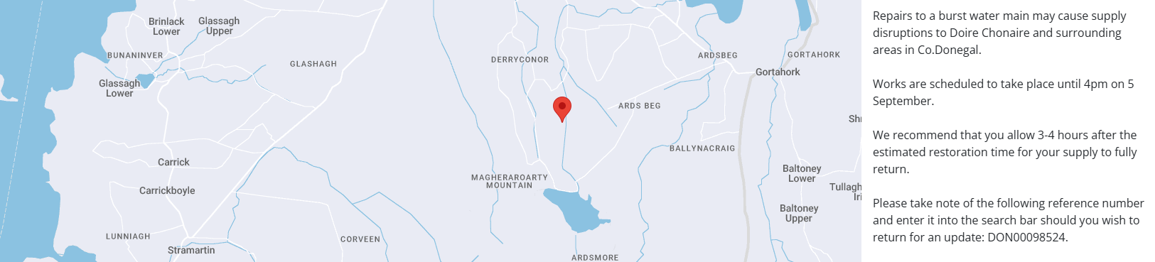 Uisce Eireann says repairs to a burst water main may cause supply disruptions to Derryconnor and surrounding areas for the next few hours.