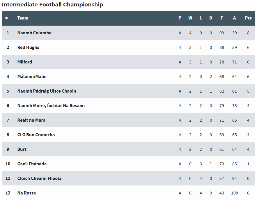 Naomh Padraig Uisce Chaoin, Naomh Mhuire Lower Rosses and Buncrana, who defeat Fanad Gaels 1-20 to 1-16, make up the rest of the top eight.