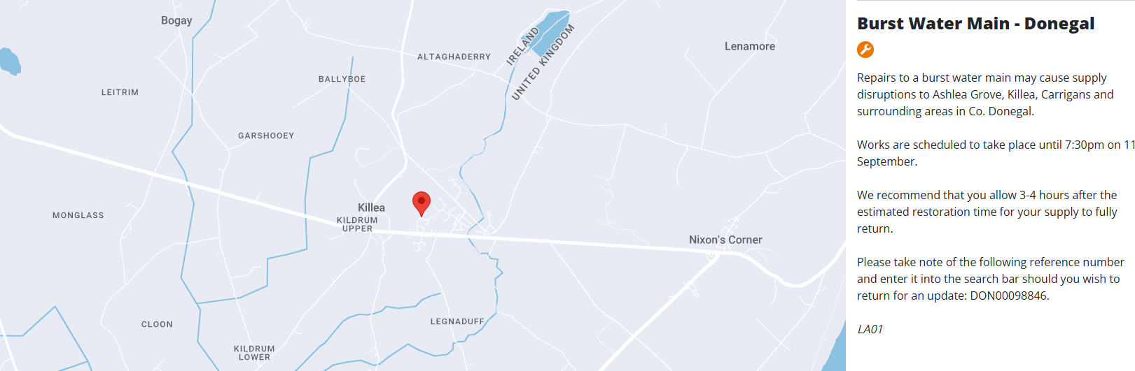 Repairs to a burst water main may cause supply disruptions to Ashlea Grove, Killea, Carrigans and surrounding areas this evening.