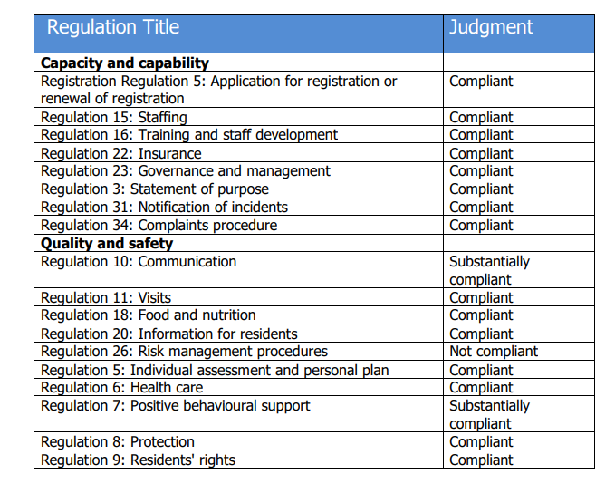 - Risk Management Procedures: A review of all residents’ risk assessments has been undertaken to further inform their care plans and behavior support plans. Nursing staff are scheduled to attend information session on risk management.