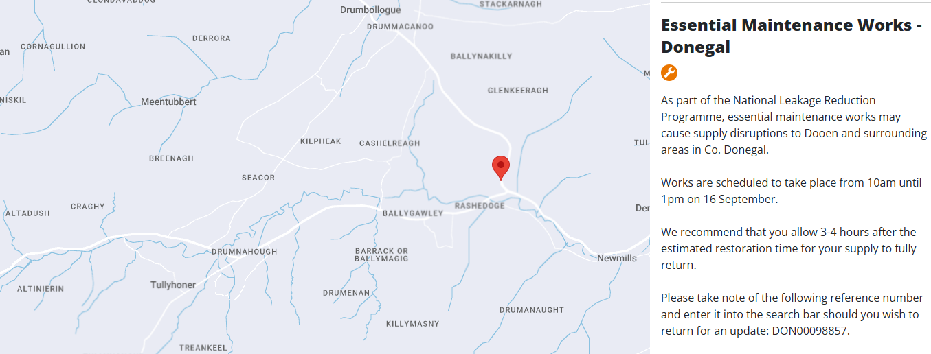 Meanwhile, as part of the National Leakage Reduction Programme, essential maintenance works close to Newmills outside Letterkenny may may cause supply disruptions to Dooen and surrounding areas from 10 o’clock this morning until 1 o’clock this afternoon.