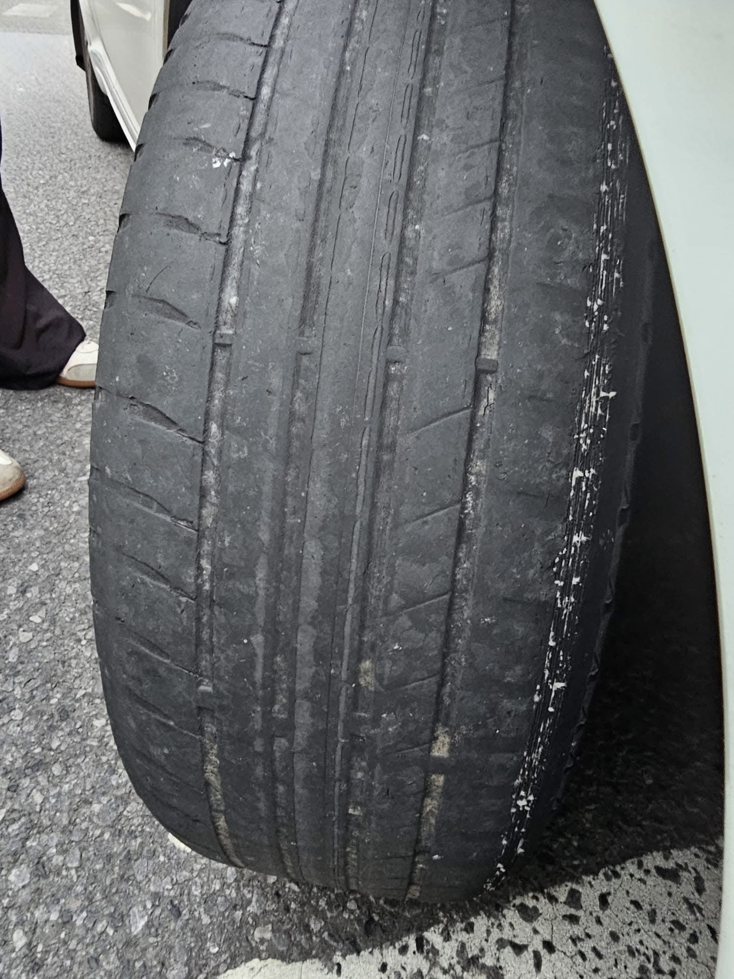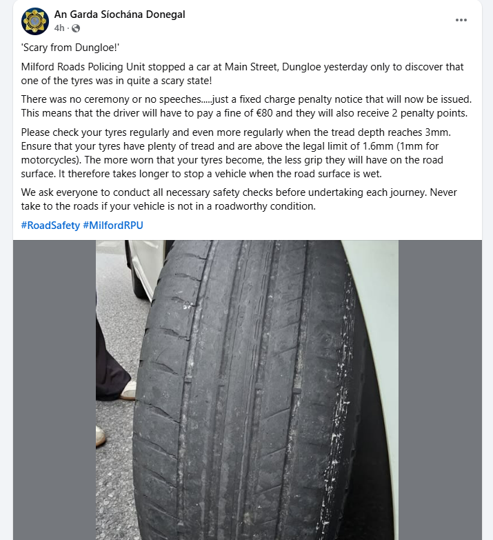It’s after one of the tyres of a vehicle stopped on Main Street, Dungloe yesterday was discovered well below the recommended tyre thread depth.