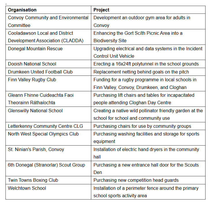 A total of €30,500 has been granted in benefit funding to 14 local projects backed by community groups, social enterprises, charities and sports clubs. These projects include an outdoor gym for adults in Convoy, a native wild pollinator-friendly garden in Glenswilly, electrical upgrades for Donegal Mountain Rescue’s Incident Control Unit and a rugby programme for schools across Finn Valley, Convoy, Drumkeen and Cloghan.