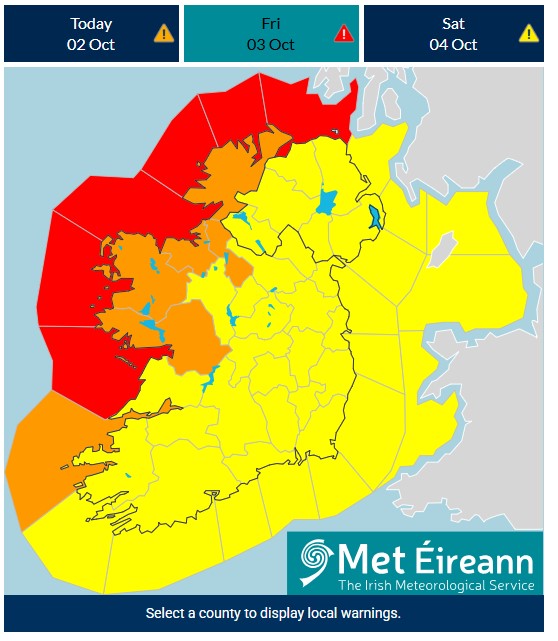 A yellow wind warning commences at 12 noon tomorrow, which will turn orange at two o’clock tomorrow afternoon.