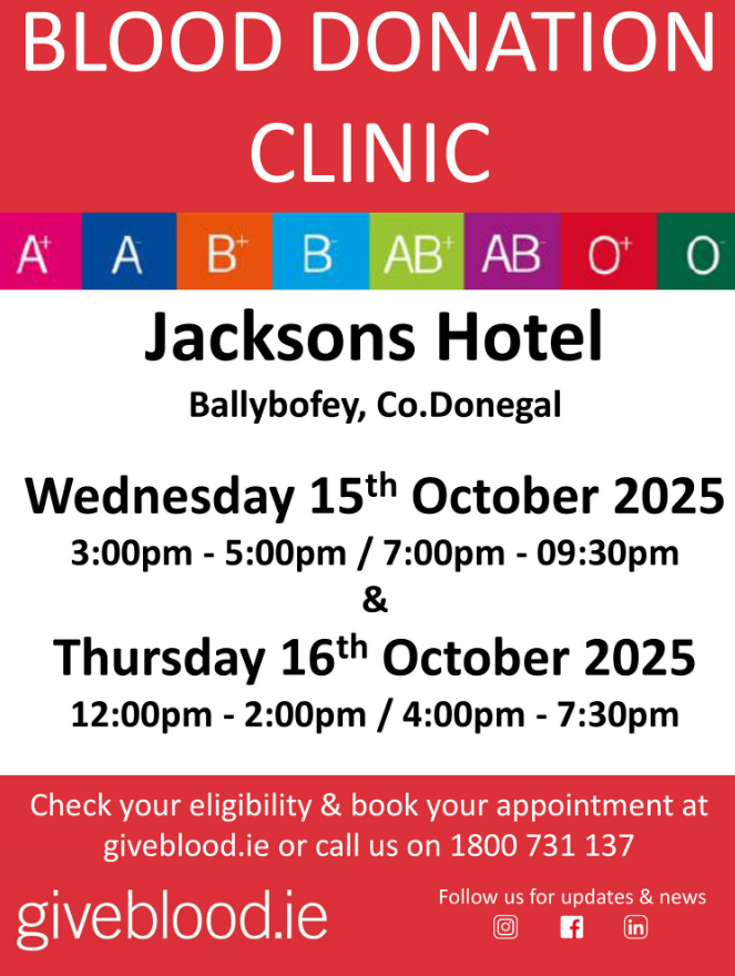 Blood Donation Clinics are being held at Jackson’s Hotel, Ballybofey today from 3pm to 5pm and from 7pm to 9:30pm and again tomorrow from 12pm to 2pm and 4pm to 7:30pm.