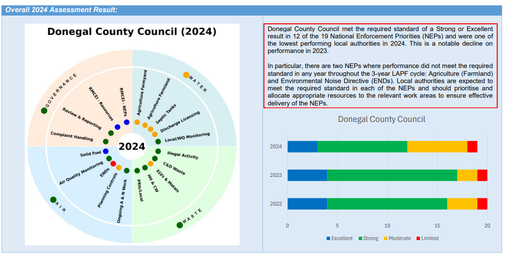 The EPA’s latest report highlights the need for improvements in 7 of 19 National Enforcement Priorities in Donegal last year. The Council did not meet the required standard over the past three years in Agriculture and Environmental Noise Directive enforcement priorities.