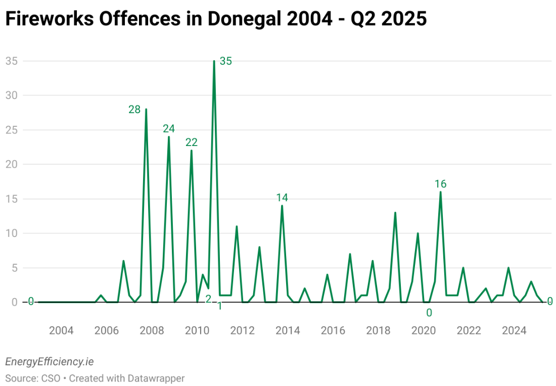 CSO data an analysed by Energey Efficiency Ireland shows a significant decrease in firework-related offences over the past 15 years in the county, with only five last year, compared to 41 in 2010. Most detections are in the months immediately before and after Halloween.