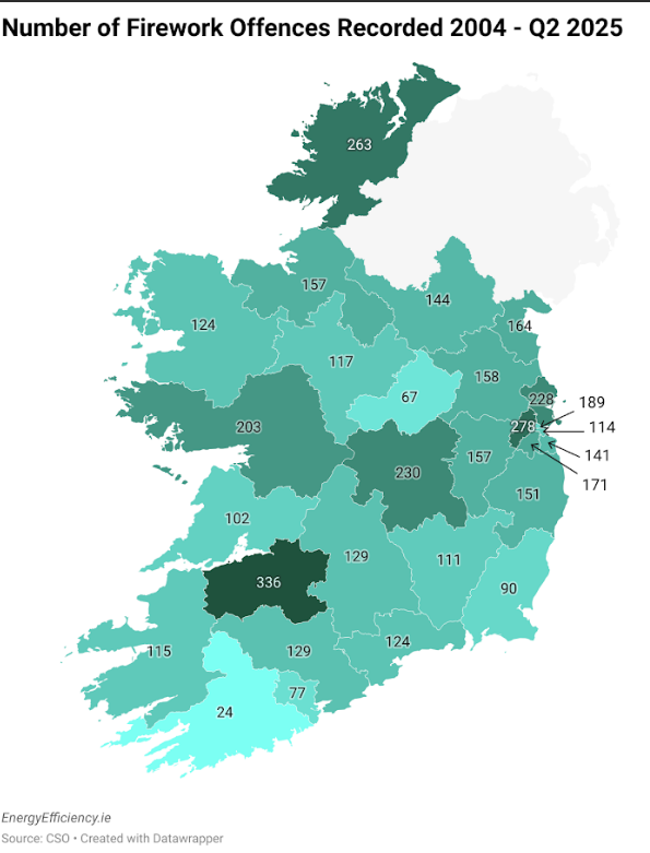 Across the six Garda divisions in Dublin, 1,021 offences related to fireworks were recorded from 2004 to Q2 2025 – around a quarter of the total.