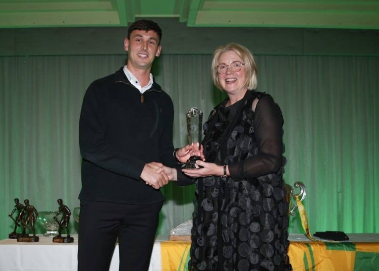 Michael Langan picking up his Inter-County Footballer of the Year Award from Mary Coughlan