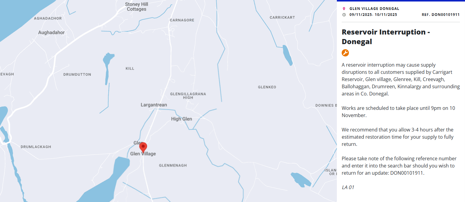 Uisce Eireann says an interruption at Carrigart Reservoir may cause disruptions for all customers supplied by the facility. This includes households, farms and businesses in Glen village, Glenree, Kill, Creevagh, Ballohaggan, Drumreen, Kinnalargy and surrounding areas.