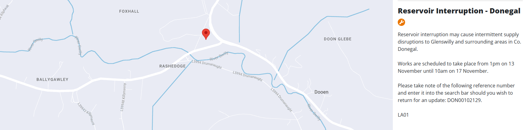 Uisce Eireann says reservoir interruption may cause intermittent supply disruptions to Glenswilly and surrounding areas over the coming days.