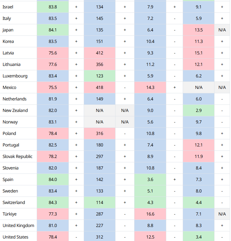 Switzerland continues to lead globally at 84.3 years, followed by Japan and Spain, while the UK lags at 81.