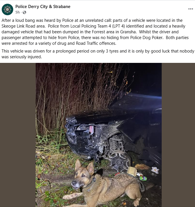 Police say after a loud bang was heard by officers on an unrelated call, parts of a vehicle were located in the Skeoge Link Road area, and a short time later, police identified and located a heavily damaged vehicle that had been dumped in Gransha.