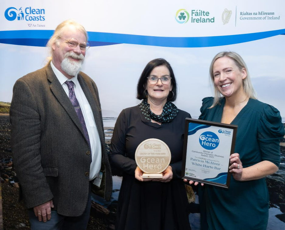 Also in Donegal, Patricia McAteer of White Harte Bar in Rathmullan was named winner of the newly re-introduced Community Champion (Business Award) for 2025. Patricia was described as a driving force behind Rathmullan Coastal Care since founding the group in 2013. Her leadership led directly to the formation of the Coastal Warriors in 2015 and continues to support the group by providing equipment and maintaining the 2-Minute Beach Clean stations. Despite her busy schedule, she remains central to supporting the ongoing action within Rathmullan Clean Coasts.