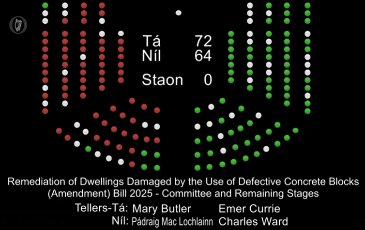 The Amended remediation of Dwellings Affected by Defective Concrete Bill has been passed in the Dail after a marathon debate last night that began at 6.45pm and ended at around 12.55 this morning.