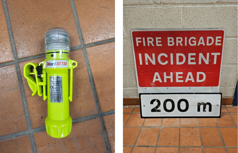 The larger sign was red and white and read “Fire Brigade Incident Ahead,” while the smaller sign was black and white and read “200 M.”