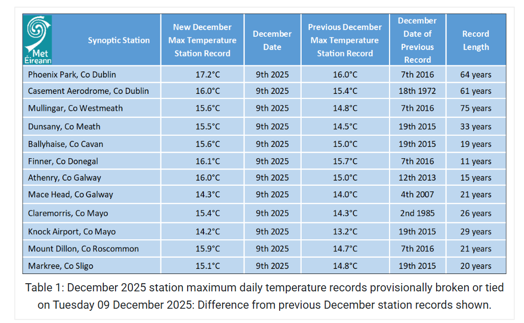 December 9th saw the hottest temperatures, with the weather station at Finner recording a temperature of 16.1%, the highest recorded in December since 2016.