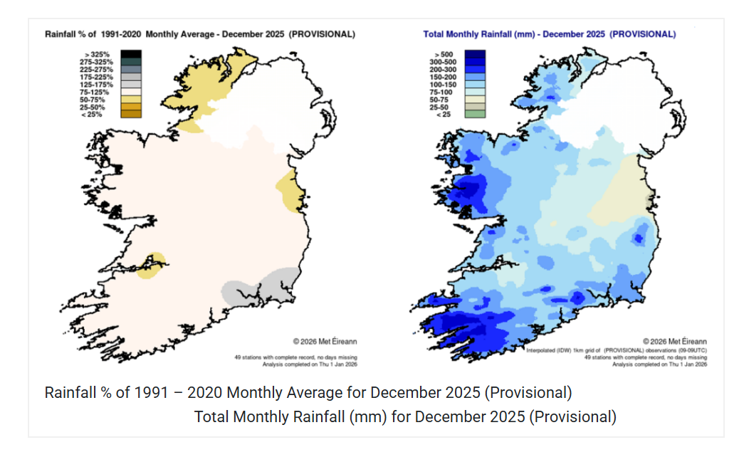 December 2025 was a mixed month. Atlantic low pressure dominated the first two thirds, bringing mild, wet and sometimes windy conditions, followed by a cool, dry and less windy final third when high pressure to the north became established. Along with widespread gales and heavy rain, Storm Bram brought a very warm tropical maritime air-mass from the south with record high maximum daily temperatures for December at twelve stations, according to the latest Climate Statement from Met Éireann.