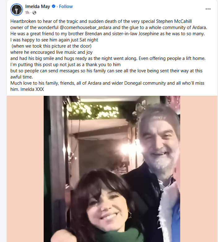 In a social media post today, she says she had been singing at the Corner House Bar in Ardara, which Mr McCahill co-owned, just last Saturday. She says it’s where he encouraged live music and joy.