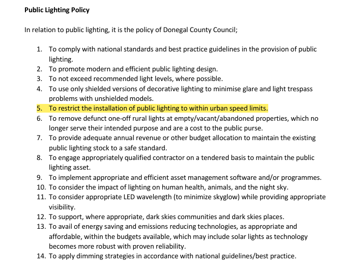 A proposed public lighting policy was opposed at today’s plenary meeting of Donegal County Council, as it would have restricted public lighting to urban speed-zone areas.