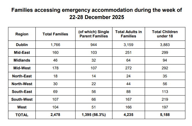 30 families were registered as homeless in the North West at the end of last month, the same as the November figured, while the number of dependent children in need of accommodation rose by three to 56, up 5%.