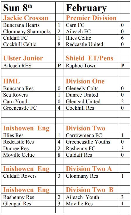 Home / News & Sport / Inishowen Football League Results – Sunday 08/02/26