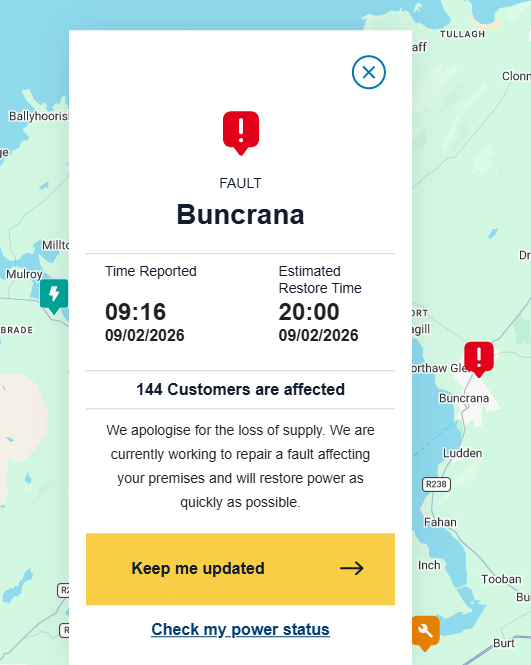 There are now 144 homes and businesses are without power in the vicinity of Buncrana this morning.