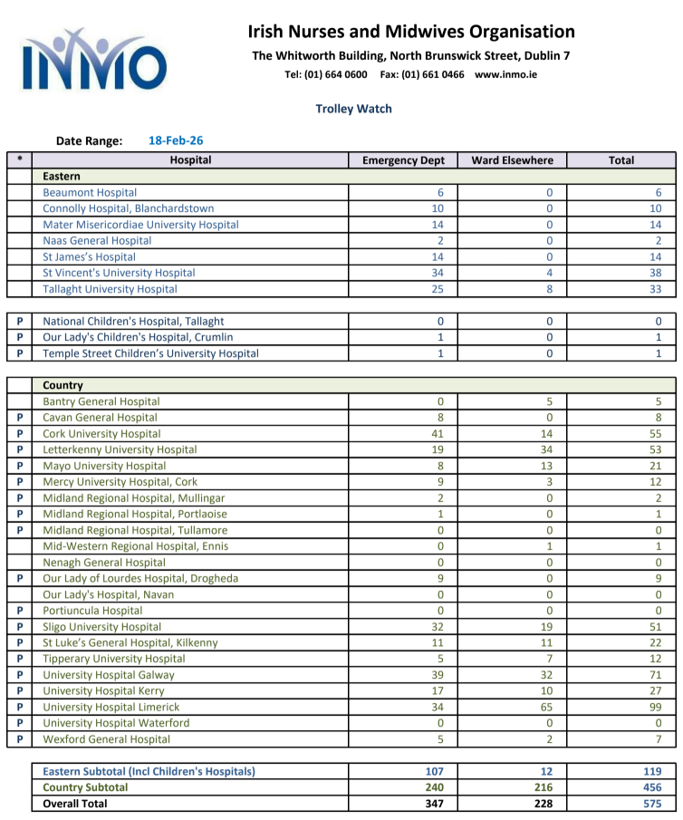 There were 575 admitted patients without beds in Irish hospitals this morning, 18% of them in the North West.