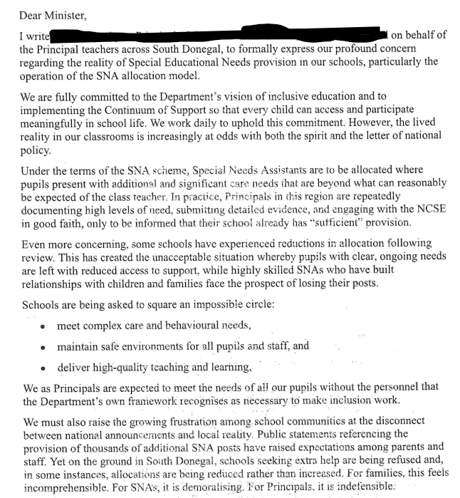 21 school principals in South Donegal have written to Education Minister Hildegarde Naughton expressing concern at how special needs education is being managed.