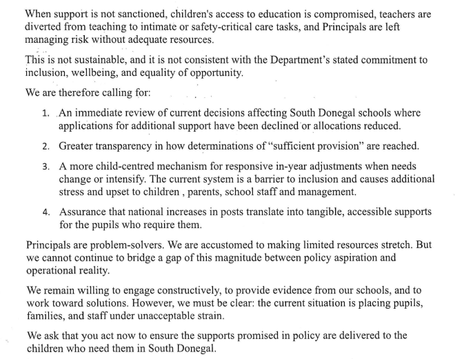 Letter written by 21 school principals in Donegal produced on the floor of the Dail