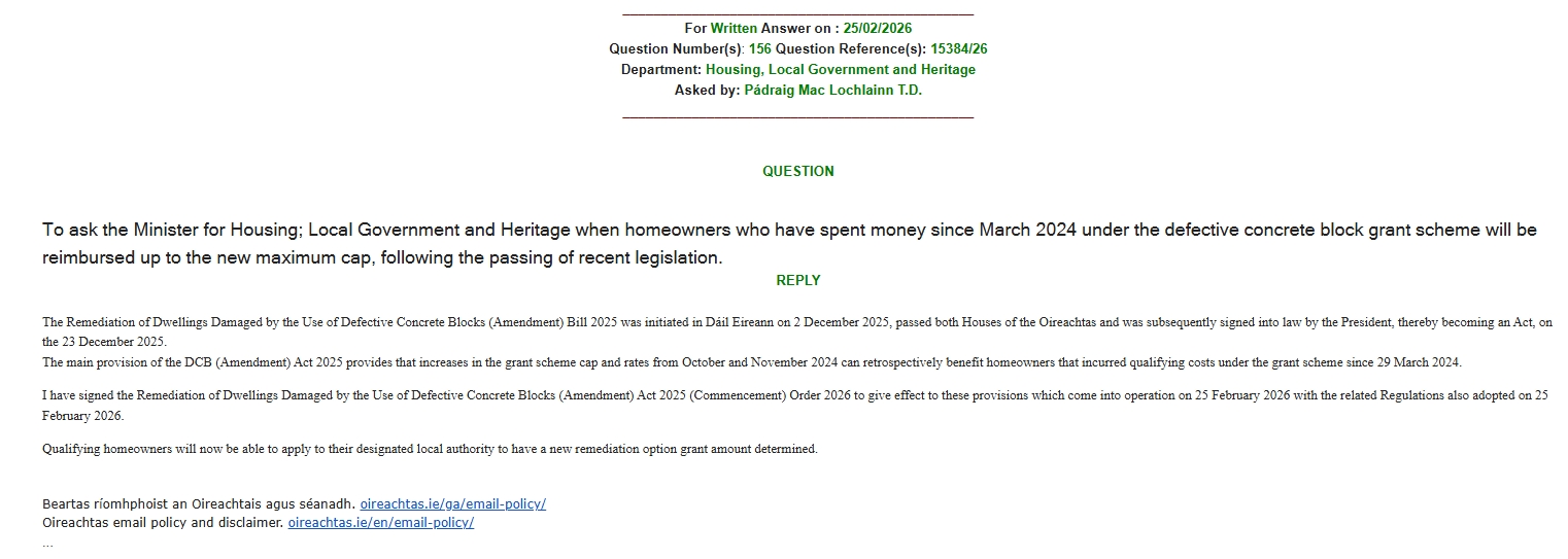 The Housing Minister has signed off on legislation allowing for retrospective payments to be made to defective block homeowners, and also facilitating the reimbursement up to the new maximum cap, following the passing of recent legislation.